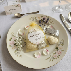 - Styl i elegancja: Złoty woreczek z organzy nadaje całości luksusowego charakteru, pasującego do każdego wystroju.