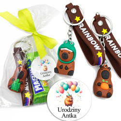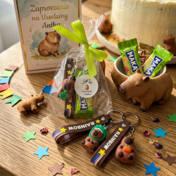 Szukasz upominku, który wywoła efekt "WOW" u dzieci? Postaw na kapibarę! Przedstawiamy gotowy zestaw prezentowy, który łączy w sobie mega modny brelok, pyszne słodkości i estetyczne opakowanie. Idealny jako podziękowanie dla gości urodzinowych, prezent do szkoły czy przedszkola.