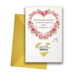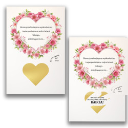 Zdrapka z ukrytym pod warstwą ścieralną ( złotym sercem) tekstem : "będziesz również niezastąpioną, ukochaną BABCIĄ"