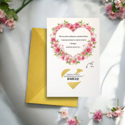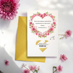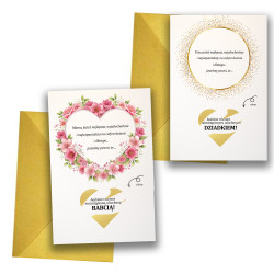 Zdrapka z ukrytym pod warstwą ścieralną ( złotym sercem) tekstem : "będziesz również niezastąpioną, ukochaną BABCIĄ / DZIADKIEM"