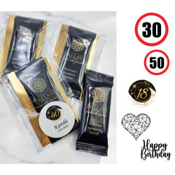 Złota tekturka + ciasteczko belgijskie. Całość zapakowana w celofan z dowolną personalizowaną naklejką.