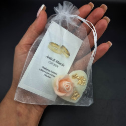 Całość zapakowana w białą elegancką organzę z personalizowaną etykietą.