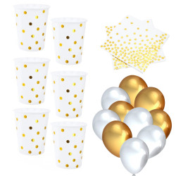 Przepiękne papierowe kubeczki w kolorze bieli z dodatkiem złotych kółeczek będą świetnym dodatkiem na różnego rodzaju imprezach. Wykorzystywane na wieczorach panieńskich, urodzinach czy roczku i baby shower. Komplet: 6 sztuk. Pojemność: 180ml. Nie zalewaj ich wrzątkiem!