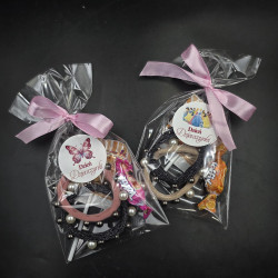 Całość zapakowana w celofan, przewiązana satynową wstążka.