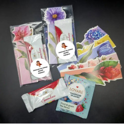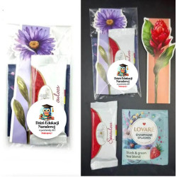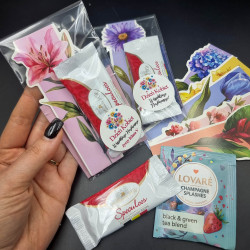 Urocza tekturkowa zakładka do książek + herbata + ciastko + naklejka z możliwością dowolnego tekstu (całość zapakowana w celofan)
