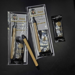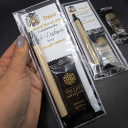 Cena za 1 sztukę gotowego upominku. Tekturka + długopis + ciastko. Całość zapakowana w celofan.