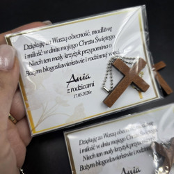 Drewniany BRELOK krzyżyk z Elegancką personalizowaną TEKTURKĄ