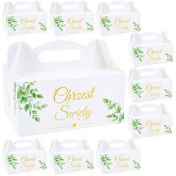 Na dwóch frontowych bokach posiada złoty napis Chrzest Święty przystrojony zielonymi listkami. Na dwóch bocznych znajduje się para złotych stópek z wyciętymi serduszkami. Wymiar nadruku:9x8cm. Świetnie sprawdzą się na ciasta, tort lub babeczki po przyjęciu tj: Chrzest Święty.