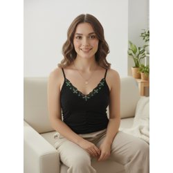 Czarny, elastyczny top na cienkich ramiączkach. Idealnie podkreśli sylwetkę oraz kobiece atuty. Górna część topu modelująca piersi zdobiona cekinami, zaś dolna część topu posiada modne marszczenia.