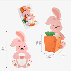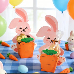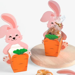 Urocze pudełeczko w kształcie różowego zajączka z marchewką, idealne na wielkanocne łakocie dla dzieci w szkole lub gości przy świątecznym stole.